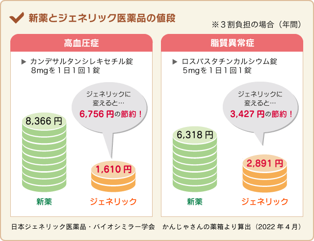 新薬からジェネリック医薬品に変えると、窓口で支払う薬代を安くできます。かぜ等、短期間しか服用しない薬ではさほど変わりませんが、脂質異常症や高血圧症、糖尿病といった慢性的な病気で、長期にわたり薬を服用する人の場合は、大きく薬代を減らすことができます。